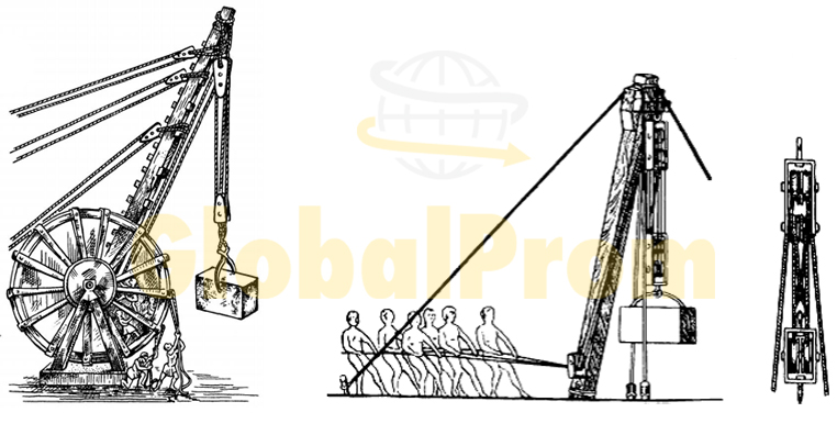 Работа талью имеет многовековую историю. Первые прототипы современных грузоподъемных устройств появились еще во времена Древнего Рима, Китая и Греции. В основном их использовали при строительстве различных древних сооружений, а также для подъема воды из колодцев и декораций в театре. В движение такие механизмы приводились благодаря мускульной силы человека или животных, а также силы льющейся воды (рис. 1).