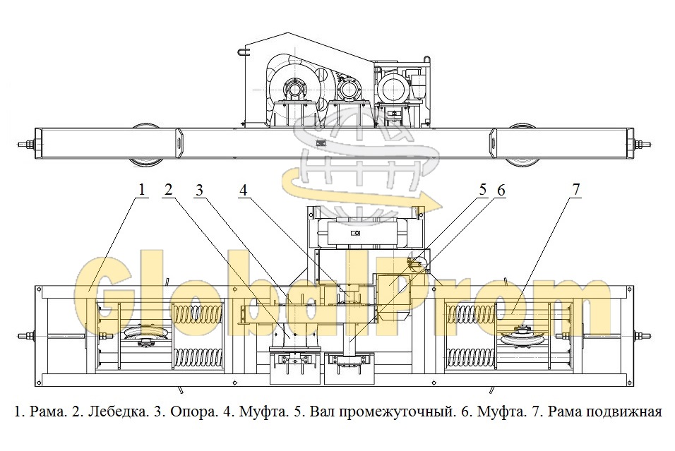 Маневровые устройства перемещения вагонов МУ работают по принципу беспрерывного троса. Имеет равное усилие перемещения как в одну, так и в другую сторону. Присутствует функция автоматического возврата троса. Канатные МУ могут быть использованы для работы в тупиках и для проходных путей. Главное преимущество МУ точность позиционирования и одинаковое усилие во время движения составов в любую сторону. Все составляющие части устройства маневрового устанавливаются на основание (станину). Составляющие части МУ смотри на схеме 1.