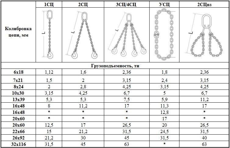 | Размер цепи, мм | Коэффициент распределения нагрузки при различных способах строповки, кг | |||||