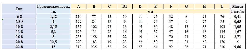 - тип гаків - 6-8, 7 / 8-8, 10-8, 13-8, 16-8, 20-8, 22-8;