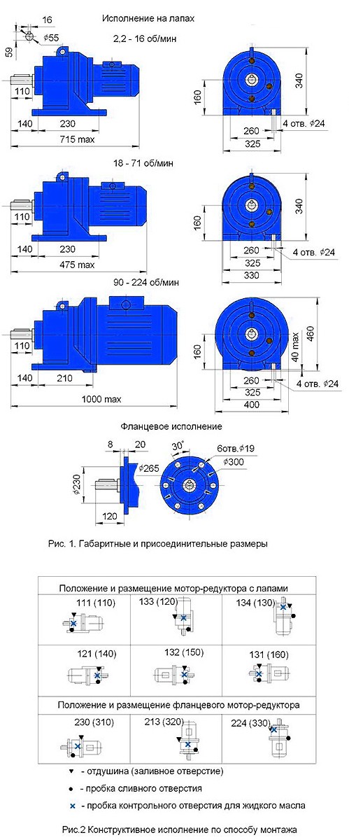 Мотор редуктора представлені 3МП-63 представлені в трьох типах виконання: трьох-, двох- і одноступеневі.- Частота обертання мотор-редукторів 3МП-63 і 4МП-63в одноступеневому виконанні становить від 112 до 280 об/хв, двоступеневому 18 - 90 об/хв, а триступеневому 2,2 - 16 об/хв.
