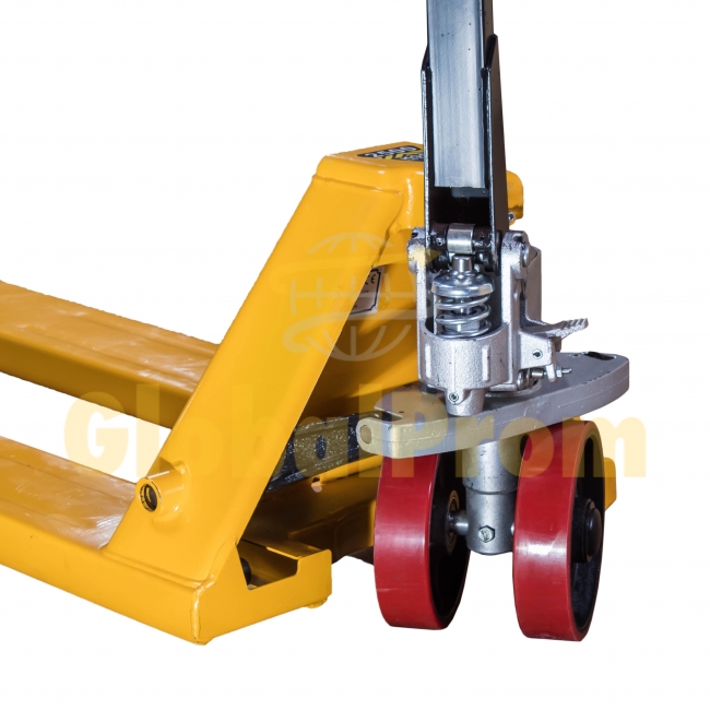 Принцип роботи візка досить простий. Той, на кому лежить управління даним агрегатом, повинен завести візок під піддон з вантажем і кілька разів повернути рукоять, щоб закріпити піддон і зафіксувати його. В результаті машина підніме товар, і його транспортування вже не завдасть жодного клопоту і пройде набагато швидше.