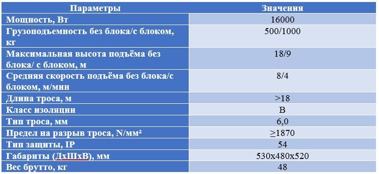 Конструкція електричної лебідки має в собі електричний двигун, потужність якого становить 1,6 кВт. Тельфер може підіймати вантаж до 0,5 тонн на висоту до 18 метрів. У комплекті також йде блок, за допомогою якого можна скоротити висоту підйому у 2 рази та збільшити вантажопідйомність до 1 тонни.